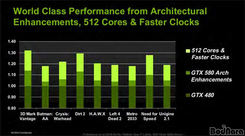 ÁöÆ÷½º GTX 580Àº ÁöÆ÷½º GTX 480º¸´Ù È¿À²À» °³¼±ÇØ ÃÖ´ë 1.1¹èÀÇ  Çâ»óÀ» ÀÌ·ç¾ú°í ¿©±â¿¡ ÁöÆ÷½º GTX 480 ´ëºñ Áõ°¡µÈ 32°³ÀÇ Äí´ÙÄÚ¾î (CUDA Cores)¿Í 4°³ ´Ã¾î³ ÅØ½ºÃ³ À¯´Ö µîÀ» ¹ÙÅÁÀ¸·Î Çâ»óµÈ Ŭ·°À» ¹ÙÅÁÀ¸·Î ÃÖ´ë 1.3¹è ´õ ³ôÀº ¼º´É Çâ»óÀ» ÀÌ·ê ¼ö ÀÖÀ» °ÍÀ¸·Î ¾Ë·ÁÁö°í ÀÖ´Ù. ¶Ç, ÁöÆ÷½º GTX 580Àº Ç®¼ÓµµÀÇ FP16 ÅØ½ºÃ³ ÇÊÅ͸µ Áö¿ø (64bit (FP16) GF110Àº Ŭ·°´ç 4ÅØ¼¿Ã³¸®, GF100Àº Ŭ·°´ç 2ÅØ¼¿Ã³¸®) ¹× Z-Cull È¿À²°ú ·¡½ºÅÍ ¿£ÁøÀ» °³¼±Çß´Ù. ÀÌ¿¡µû¶ó °ú°ÅÀÇ °ÔÀӵ麸´Ù »õ·Î¿î ¼¼´ë (DX10/ DX11)¿¡¼ ´õ ³ôÀº ¼º´ÉÀÇ Çâ»óÀÌ ÀÌ·ç¾îÁú °ÍÀ¸·Î ¿¹»óµÈ´Ù.