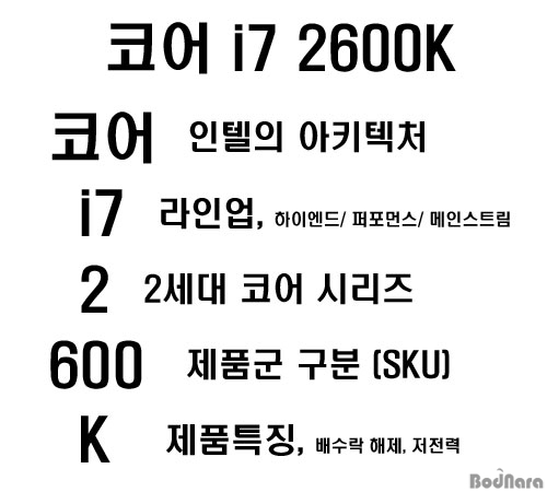 ÄÚ¾î i7 2600K¸¦ ¿¹·Îµé¸é ÄÚ¾î´Â ÀÎÅÚÀÇ CPU ¾ÆÅ°ÅØÃ³¸¦ ÀǹÌÇϸç, »÷µðºê¸´Áö´Â 2¼¼´ë ÄÚ¾î ÇÁ·Î¼¼¼·Î ºÒ¸°´Ù. i7Àº ºê·£ °£ÀÇ À§Ä¡ (i7ÀÇ °æ¿ì ÇÏÀÌ¿£µå/ ÆÛÆ÷¸Õ½º Á¦Ç°±º, i5´Â ÆÛÆ÷¸Õ½º/ ¸ÞÀνºÆ®¸² Á¦Ç°±º, i3´Â ¸ÞÀνºÆ®¸² Á¦Ç°±º, ÆæÆ¼¾öÀº º¸±ÞÇü/ Àú°¡Çü Á¦Ç°±º), 2600 ¼ýÀÚ Áß Á¦ÀÏ Ã³À½ÀÇ 2´Â 2¼¼´ë ÄÚ¾î ¾ÆÅ°ÅØÃ³, 600Àº SKU ¼ýÀÚ·Î ¼ýÀÚ°¡ ³ôÀ»¼ö·Ï ¼º´ÉÀÌ ¿ì¼öÇÑ CPU´Ù.