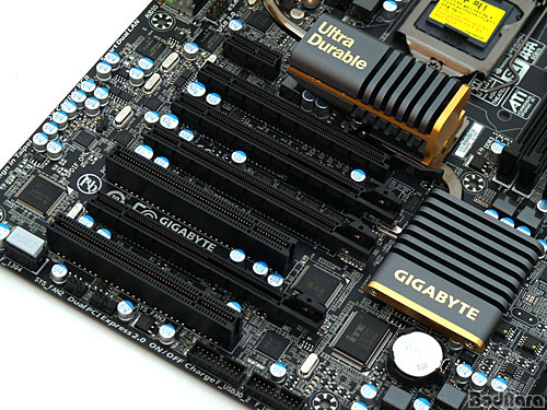 GIGABYTE GA-P67A-UD7Àº Â÷¼¼´ë ÀÎÅÍÆäÀ̽ºÀÎ USB 3.0 (5Gbps, USB 2.0Àº 480Mbps)¿Í SATA3 (6Gbps) µîÀ» ºñ·ÔÇÏ¿© ¸ÖƼ GPU ±â¼úÀÎ AMD CrossFire X¿Í ¿£ºñµð¾Æ (NVIDIA) SLi¸¦ 2/3-Way·Î Áö¿øÇÏ´Â Ç®½ºÆå ¸ÞÀκ¸µå·Î ÇÏÀÌ¿£µå ¶óÀξ÷¿¡ À§Ä¡ÇÑ´Ù. USB 3.0Àº ¹éÆÐ³Î 6°³¿Í ÇÉ Çì´õ¸¦ ÅëÇØ 4°³¸¦ Ãß°¡ Áö¿øÇØ ÃÑ 10°³ ÀåÄ¡±îÁö È®Àå °¡´ÉÇϸç, SATA3 Áö¿øµµ P67 ³×ÀÌÆ¼ºê 2Æ÷Æ® Áö¿ø¿¡ RAID 0/1 Áö¿ø Marvell 88SE9128 ÄÁÆ®·Ñ·¯ 2°³ ÀåÂøÇØ Ãß°¡ 2Æ÷Æ®¿Í eSATA3 2Æ÷Æ®¸¦ Áö¿øÇÑ´Ù.
