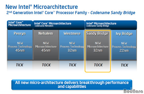 ÀÎÅÚÀº Áö³ 2008³â 45nm °øÁ¤°ú ÄÚ¾î ¸¶ÀÌÅ©·Î¾ÆÅ°ÅØÃ³¸¦ °³¼±ÇÑ »õ·Î¿î ¾ÆÅ°ÅØÃ³ÀÎ ³×ÇÒ·½ ¾ÆÅ°ÅØÃ³¸¦ ¼Ò°³Çß°í 32nm·Î °øÁ¤À» °³¼±ÇÑ ¿þ½ºÆ®¹Ì¾î (Westmere)¸¦ Áö³ ÇØ ÃÊ °ø°³Çß´Ù. ¿ÃÇØ´Â Àü·«»ó Åå (Tock) Áï, »õ·Î¿î ¾ÆÅ°ÅØÃ³°¡ Àû¿ëµÇ´Â ½ÃÁ¡À¸·Î »÷µðºê¸´Áö (Sandy Bridge)´Â ±âÁ¸ Ŭ¶ôµ¥ÀÏ (Clarkdale)ÀÇ CPU¿Í GPU ÅëÇÕ ½Ãµµ¿¡¼ ÇÑ¹ß ´õ ¾Õ¼ ÁøÁ¤ÇÑ ÅëÇÕ ÇÁ·Î¼¼¼ÀÇ ½ÃÀÛÀ» ¾Ë¸®°í ÀÖ´Ù.