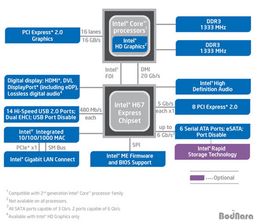 ÀÎÅÚ P67/ H67 Ĩ¼ÂÀº LGA1155 ¼ÒÄÏ ±â¹ÝÀÇ 32nm »÷µðºê¸´Áö¸¦ Áö¿øÇϸç, P55/ H55¿Í ºñ±³ÇØ ÇÉ ¼ö°¡ Çϳª ÁÙ¾úÁö¸¸, ȣȯÀº µÇÁö ¾Ê´Â´Ù. ³»Àå ±×·¡ÇÈÄÚ¾î Ãâ·ÂÀº H67¸¸ °¡´ÉÇϸç, FDI ÀÎÅÍÆäÀ̽º¸¦ Áö¿øÇÏ°í ³»Àå ±×·¡ÇÈ Ãâ·Â°ú H57/ H55 Ĩ¼Â¿¡¼ Áö¿øÇÏÁö ¾Ê´Â 3D ½ºÅ×·¹¿À (Stereoscopic 3D) ±â¼úÀÎ InTru 3D¿Í HDMI 1.4 ±Ô°Ý Áö¿øÀ¸·Î ºí·ç·¹ÀÌ 3D (Blu-Ray 3D)µµ Áö¿øµÈ´Ù.