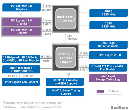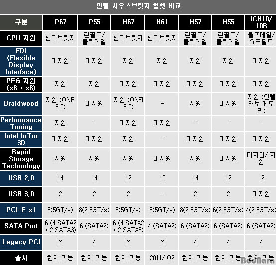 ÀÎÅÚ 6½Ã¸®Áî Ĩ¼Â¿¡´Â P67/ H67, ±×¸®°í º¸±ÞÇüÀÇ H61·Î ¾Ë·ÁÁø Ĩ¼ÂÀÌ 2011³â 2ºÐ±â µîÀåÇÒ °ÍÀ¸·Î ¿¹»óµÇ°í ÀÖ´Ù. P67/ H67Àº P55/ H55 Ĩ¼Â°ú °°ÀÌ CPU¿¡ ³ë½ººê¸´Áö ±â´ÉÀÎ PCIe ¹ö½º ÄÁÆ®·Ñ·¯¿Í DDR3 µà¾óä³Î ¸Þ¸ð¸® ÄÁÆ®·Ñ·¯ µîÀÌ ¸ðµÎ Æ÷ÇԵǹǷΠ»ç¿ì½ººê¸´Áö ±â´ÉÀ» ÁÖ·Î Áö¿øÇϸç, ¿øÄ¨ ¼Ö·ç¼ÇÀÎ ºÎºÐÀº °°´Ù. ±×·¯³ª, »÷µðºê¸´Áö CPU¿Í P67/ H67 Ĩ¼Â°£ÀÇ DMI´Â P55/ H55ÀÇ 2.5GT/sÀÇ 2¹èÀÎ 5GT/sÀÇ Àü¼Û¼Óµµ¸¦ Á¦°øÇØ Â÷¼¼´ë ÀÎÅÍÆäÀ̽º Áö¿ø µî¿¡ ´ëÀÀÇÒ ¼ö ÀÖµµ·Ï ¹Ù²î¾ú´Ù.