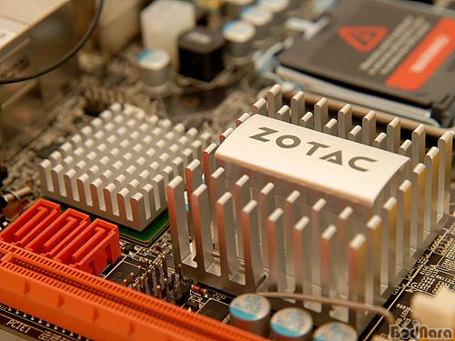 ZOTACÀÇ ·Î°í°¡ ±×·ÁÁø È÷Æ®½ÌÅ© ¾Æ·¡¿¡´Â ÀÎÅÚ G41 Ĩ¼ÂÀÌ À§Ä¡Çϰí ÀÖÀ¸¸ç ±× ¿·À¸·Î ICH7ÀÌ ÀÚ¸®Àâ°í ÀÖ´Ù. ¾Æ·¡·Î 3°³ÀÇ SATA 3Gb/s Æ÷Æ®°¡ ÀÖ´Ù.