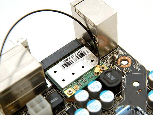 ZOTAC G41-ITX WiFi´Â 802.11nÀ» Áö¿øÇÏ´Â ¹«¼±·£À» ±âº» ÀåÂøÇϰí ÀÖ´Ù. ±âÆÇ¿¡ ÄÁÆ®·Ñ·¯¸¦ ³»Àå ÇÏ´Â ¹æ½ÄÀÌ ¾Æ´Ñ mini PCI Express ½½·Ô¿¡ ¹«¼±·£ ¸ðµâÀ» ÀåÂøÇÏ¿© Áö¿øÇÑ´Ù.