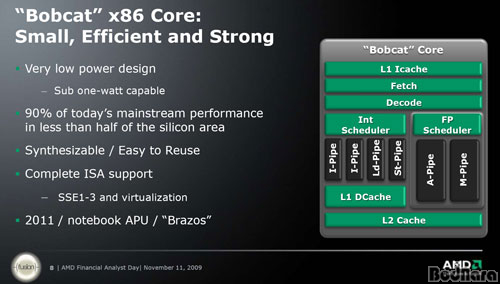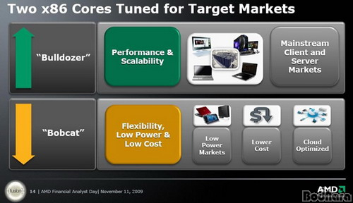 2011³â AMD°¡ Ãâ½ÃÇÒ ÇÁ·Î¼¼¼´Â Å©°Ô °í±ÞÇü µ¥½ºÅ©Å¾ ½ÃÀåÀ» °Ü³ÉÇÑ ºÒµµÀú(Bulldozer) °è¿ Á¦Ç°°ú ³ëÆ®ºÏ ¹× º¸±ÞÇü ½ÃÀåÀ» À§ÇÑ ¹äÄÏ(Bobcat) °è¿ Á¦Ç°À¸·Î ³ª´µ°Ô µÈ´Ù. ±×Áß ¹äÄÏ °è¿ÀÇ Á¦Ç°µéÀº ¸ðµÎ Ç»Àü APU°¡ Àû¿ëµÈ ÄÚµå¸í Zacate¿Í ÄÚµå¸í OntarioµîÀÌ ¼±º¸ÀÏ ¿¹Á¤ÀÌ´Ù.