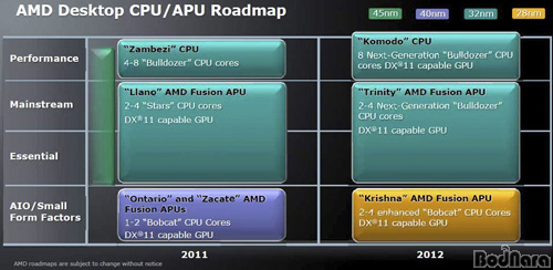 2011³â¿¡ °¡Àå ¸ÕÀú ¼±º¸ÀÏ ºÒµµÀú ¾ÆÅ°ÅØÃÄ ±â¹ÝÀÇ Zambezi ÇÁ·Î¼¼¼´Â GPU¸¦ ³»ÀåÇÏÁö ¾Ê´Â ´ë½Å ¶óµ¥¿Â HD 6000½Ã¸®Áî¿ÍÀÇ Á¶ÇÕÀ¸·Î º¸´Ù Å« ¼º´ÉÀ» Á¦°øÇÒ °ÍÀ̸ç 2012³â¿¡´Â GPU ±â´ÉÀ» ÅëÇÕÇÑ ºÒµµÀúÀÎ ÄÚ¸ðµµ(Komodo) ¿Í Æ®¸®´ÏƼ(Trinity)°¡ ¼±º¸ÀÏ ¿¹Á¤ÀÌ´Ù.