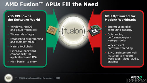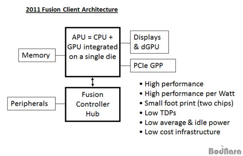 CPU¿Í GPU¸¦ ÀÌ¿ëÇÑ ÄÄÇ»ÆÃ ºñ¿ëÀ» ÁÙÀÌ°í ºÒ±ÕÇüÀûÀÎ ¼º´ÉÀ» ²ø¾î¿Ã·Á ÃÖ»óÀÇ ¼º´ÉÀ» À̲ø¾î³»´Â ¸ñÀûÀ¸·Î ±¤¹üÀ§ÇÑ Ç»Àü (Fusion)ÀÇ °³³äÀ» »ç¿ëÇßÀ¸¸ç, ÇÁ·Î¼¼½Ì ´É·ÂÀ» Çâ»ó½ÃŲ´Ù´Â Àǹ̷ΠAPU (Accelerated Processing Units)À¸·Îµµ ºÒ¸°´Ù.