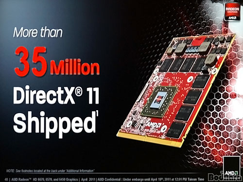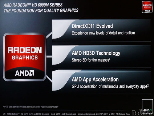 ¶óµ¥¿Â HD 6000M ³ëÆ®ºÏ¿ë ¶óµ¥¿Â ½Ã¸®Áî´Â 3õ 5¹é¸¸ °³°¡ ¼±ÀûµÇ¾î 2¼¼´ë DX11 ³ëÆ®ºÏ¿ë ½ÃÀåÀ» ´Ã·Á°¡°í ÀÖÀ¸¸ç, µ¥½ºÅ©Å¾¿ë Á¦Ç°µéÀÇ Æ¯Â¡ÀÎ DX11 Áö¿øÀ» ºñ·ÔÇÏ¿© 3D ½ºÅ×·¹¿À ±â¼úÀÎ AMD HD3D, ±×¸®°í GPGPU¸¦ À§ÇÑ AMD App Acceleration ±â¼úµµ Áö¿øµÈ´Ù. ¶ÇÇÑ, Å×¼¿·¹ÀÌ¼Ç Ã³¸® È¿À²À» Áõ°¡½ÃÄ×°í AA/ AF 󸮸¦ ¹ÙÅÁÀ¸·Î À̹ÌÁö ǰÁú Çâ»ó, ¾ÆÅ°ÅØÃ³ ÃÖÀûÈ·Î DirectCompute¿Í °ÔÀÌ¹Ö ¼º´ÉÀ» ÀÌÀü ¼¼´ëº¸´Ù °³¼±ÇßÀ¸¸ç, µð½ºÇ÷¹ÀÌÆ÷Æ® (DP 1.2, DisplayPort 1.2)¿Í HDMI 1.4a (ºí·ç·¹ÀÌ 3D Áö¿ø)µµ Áö¿øµÈ´Ù.