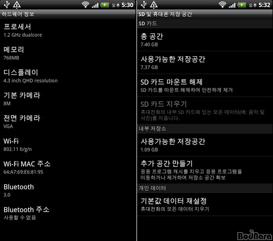 ½Ã½ºÅÛ Á¤º¸¸¦ »ìÆìº¸¸é ¼¾¼¼À̼ÇÀÇ Çϵå¿þ¾î »ç¾ç ¹× ³»Àå ¸Þ¸ð¸® »ç¿ë·® µîÀ» ÆÄ¾ÇÇÒ ¼ö ÀÖ´Ù. ¾Õ¼ ¼³¸íÇßµí ¼¾¼¼À̼ÇÀº ±âº» ³»Àå ¸Þ¸ð¸®°¡ 1GB¶ó°í Ç¥±âÇϰí Àִµ¥, ¼³Á¤¿¡¼ ³»ºÎ ÀúÀå¼Ò °ø°£À» º¸¸é »ç¿ë °¡´ÉÇÑ ÀúÀå°ø°£ÀÇ Å©±â°¡ 1.09GB³ª µÇ´Â °ÍÀ» È®ÀÎÇÒ ¼ö ÀÖ´Ù.