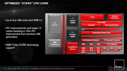 32nm °øÁ¤À» µµÀÔÇÑ ¶ó³ë APUÀÇ CPU ¾ÆÅ°ÅØÃ³´Â ±âÁ¸ ½ºÅ¸ ÄÚ¾îÀÇ ¾ÆÅ°ÅØÃ³ ÃÖÀûÈ¿¡ ÁßÁ¡À» µÐ Husky ÄÚ¾î·Î ¾Ë·ÁÁ³À¸¸ç, ±ØÀûÀÎ ¼º´É Çâ»óÀº ¾øÁö¸¸ L2 ij½Ã¸¦ ÄÚ¾î´ç 512KB¿¡¼ 1MB·Î È®ÀåÇϰí IPC¸¦ ÃÖÀûÈÇÏ¿© ÀÌÀü ¼¼´ë¿¡ ºñÇØ 6% ÀÌ»ó ¼º´ÉÀÌ Çâ»óµÈ °ÍÀ¸·Î AMD´Â ¼Ò°³Çϰí ÀÖ´Ù.