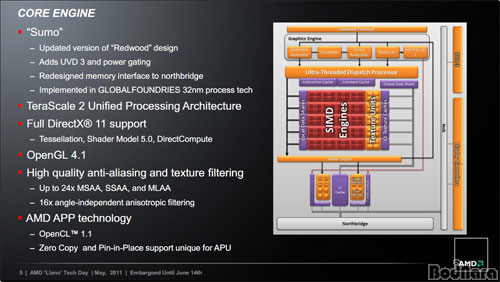 ¶ó³ë APU¿¡ ÅëÇÕµÈ Sumo ±×·¡ÇÈ ÄÚ¾î´Â Radeon HD 5600/ 5500 ½Ã¸®Áî¿¡ »ç¿ëµÈ VLIW5 ¾ÆÅ°ÅØÃ³ ±â¹Ý Redwood ÄÚ¾îÀÇ ¾÷µ¥ÀÌÆ® ¹öÀüÀ¸·Î, HD 5000 ½Ã¸®ÁîÀÇ UVD 2 ´ë½Å Radeon HD 6000 ½Ã¸®Áî¿¡¼ Áö¿øÇÏ´Â UVD 3°ú ÅëÇÕÀ» À§ÇÑ ¸Þ¸ð¸® ÀÎÅÍÆäÀ̽º ÀçµðÀÚÀÎ °úÁ¤À» °ÅÃÆ´Ù.