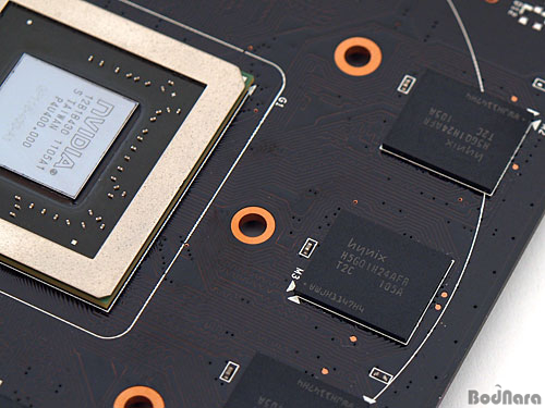ÁöÆ÷½º GTX 550 Ti O.C´Â ÇÏÀ̴нºÀÇ GDDR5 ¸Þ¸ð¸® Ĩ (H5GQ1H24AFR-T2C)ÀÌ Àü¸é¿¡¸¸ ¸ðµÎ 6°³°¡ ÀåÂøµÇ¾î 1GB ¿ë·®À» Á¦°øÇϸç, 0.4ns ¼Óµµ·Î 5Gbps È¿À²À» Á¦°øÇϰí 192bit ¸Þ¸ð¸® ÀÎÅÍÆäÀ̽º°¡ Àû¿ëµÈ´Ù.
