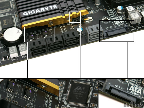 Marvell 88SE9172°¡ ÄÁÆ®·ÑÇÏ´Â 2°³ÀÇ SATA 6Gbps Æ÷Æ®ÀÇ »öÀº ±×·¹ÀÌ·Î SB950ÀÌ ÄÁÆ®·ÑÇÏ´Â 6°³ÀÇ ºí·¢ SATA Æ÷Æ®¿Í ±¸º°ÇÏ¿´À¸¸ç, ±×·¹ÀÌ SATA Æ÷Æ® Ãø¸é¿¡´Â ¸ÖƼ GPU ±¸¼º½Ã Àü·Â ºÎÁ·À¸·Î ÀÎÇØ ¹ß»ýÇÒ ¼ö ÀÖ´Â ¹®Á¦¸¦ ÇØ°áÇϱâ À§ÇØ SATA Àü¿ø Ä¿³ØÅ͸¦ ±¸¼ºÇß´Ù.