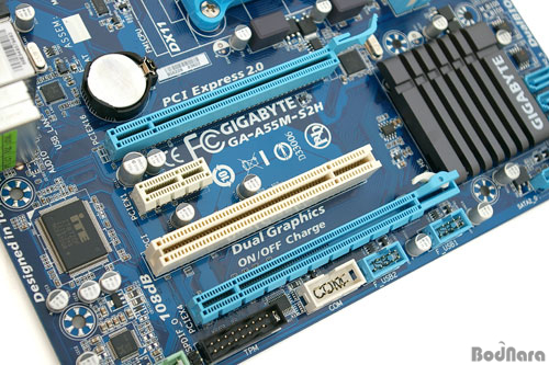 AMD ¶ó³ë APU´Â ÅëÇÕµÈ ±×·¡ÇÈ ÄÚ¾î ¿Ü¿¡ º¸±ÞÇü AMD Radeon HD 6000 ½Ã¸®Áî ±×·¡ÇÈ Ä«µå¸¦ Á¶ÇÕÇØ ±×·¡ÇÈ ¼º´ÉÀ» Çâ»ó ½Ãų ¼ö ÀÖ´Â µà¾ó ±×·¡ÇÈ ±â¼úÀ» Áö¿øÇϸç, À̸¦ À§ÇØ GA-A55M-S2H¿¡´Â Ãß°¡ ±×·¡ÇÈ Ä«µå¸¦ ÀåÂøÇϱâ À§ÇÑ PCIe x16 È®Àå ½½·Ô 1°³°¡ Áö¿øµÈ´Ù.
