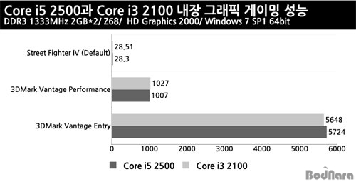 ¾Õ¼ µ¿ÀÏÇÑ ±×·¡ÇÈ Äھ ÅëÇÕµÈ ÄÚ¾î i3 2100¿¡¼ ÄÚ¾î i5 2500À¸·Î ¾÷±×·¹À̵å ÇßÀ» ¶§ ÀüüÀûÀÎ ½Ã½ºÅÛ ¼º´ÉÀº Çâ»óµÇ¾úÁö¸¸, ±×·¡ÇÈ Ä«µåÀÇ ¼º´ÉÀÌ CPU ¼º´ÉÀ» µÞ¹Þħ ÇØÁÖÁö ¸øÇÑ °æ¿ì ÄÚ¾î i3 2100 ½Ã½ºÅÛ°ú ÄÚ¾î i5 2500 ½Ã½ºÅÛÀÌ °ÅÀÇ Â÷À̾ø´Â °ÍÀ» ¾Ë ¼ö ÀÖ¾ú´Ù.
