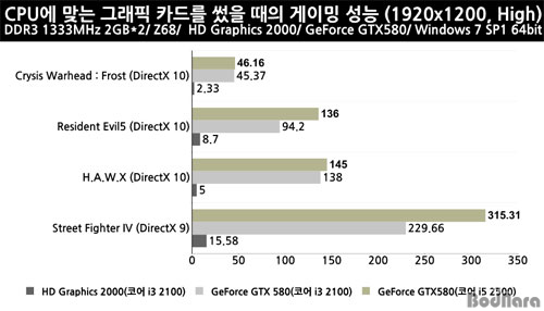 Crysis Warhead¿Í Resident Evil5, H.A.W.X¸¦ 1920x1200 ÇØ»óµµ¿¡ °¢ °ÔÀÓÀÇ ÃÖ°í ¿É¼ÇÀ¸·Î Ç÷¹ÀÌ ÇßÀ» ¶§, ÄÚ¾î i3 2100 ½Ã½ºÅÛ¿¡¼ HD Graphics 2000°ú ÁöÆ÷½º GTX 580 ±×·¡ÇÈ Ä«µå¸¦ »ç¿ëÇÑ °á°ú¸¦ ºñ±³ÇØ º¸¸é, ±×·¡ÇÈ Ä«µå¸¦ ¾÷±×·¹À̵å ÇßÀ» ¶§ÀÇ °ÔÀÓ ¼º´ÉÀÌ ¿ùµîÇÔÀ» ¾Ë ¼ö ÀÖ´Ù.