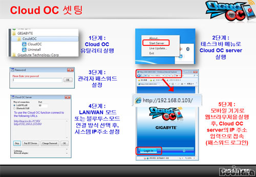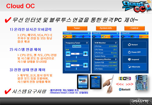 ±â°¡¹ÙÀÌÆ® (GIGABYTE) Ŭ¶ó¿ìµå OC°¡ ½º¸¶Æ® ±â±â¸¦ ÀÌ¿ëÇÑ PC Á¦¾îÀÇ ´ëÇ¥ÀûÀÎ ¼Ö·ç¼ÇÀ̸ç, Ŭ¶ó¿ìµå OC´Â À¯¼±°ú ¹«¼±, ºí·çÅõ½º (Bluetooth) ¿¬°áÀ» ¹ÙÅÁÀ¸·Î ¾ÆÀÌÆÐµå (iPad)¿Í ¾ÆÀÌÆù (iPhone), ³ëÆ®ºÏ, ³ÝºÏ ±×¸®°í ÀÎÅͳÝÀ» »ç¿ëÇÒ ¼ö ÀÖ´Â °¢Á¾ ÇÚµåÆùÀ» ÅëÇØ ½Ç½Ã°£À¸·Î Æ©´× ¶Ç´Â ½Ã½ºÅÛ °¨½Ã°¡ °¡´ÉÇØÁ³´Ù.