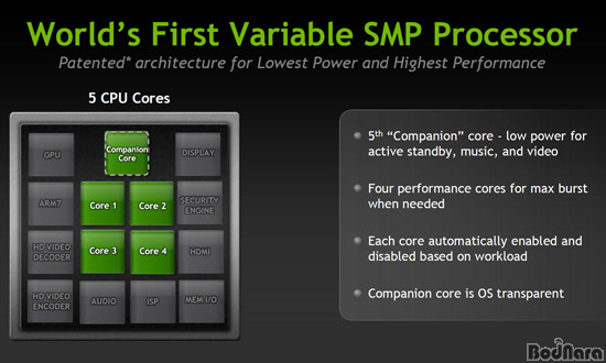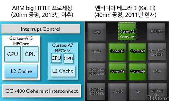 ¿£ºñµð¾Æ Å×±×¶ó 3´Â Cortex-A9 ±â¹ÝÀÇ ÄõµåÄÚ¾î ¼º´ÉÀ» ±×´ë·Î À¯ÁöÇÏ¸é¼ ÀúÀü·Â º¸Á¶ Äھ Ãß°¡ÇØ ´ë±â »óÅÂ¿Í ±âº» ÀÛ¾÷À» ¼öÇàÇϵµ·Ï µðÀÚÀÎÇß´Ù. ¸ÞÀÎ ÄÚ¾î¿Í º¸Á¶ Äھ ¸ðµÎ Cortex-A9À̱⠶§¹®¿¡ Context SwichingÀ» À§ÇÑ ¼ÒÇÁÆ®¿þ¾î ´Ü°è¸¦ °ÅÄ¡Áö ¾Ê°í Çϵå¿þ¾î ·¹º§¿¡¼ ÄÚ¾î ÀüȯÀÌ ÀÌ·ïÁú ¼ö ÀÖ´Â °ÍÀ¸·Î ¾Ë·ÁÁø´Ù.