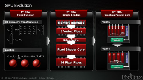 ¿£ºñµð¾Æ´Â DirectX 11·Î ³Ñ¾î°¡¸é¼ Æä¸£¹Ì¿¡ MIMD (Multiple Instruction, Multiple Date)ÀÇ 1D ½ºÄ®¶ó ¾ÆÅ°ÅØÃ³·ÎÀÇ º¯È¸¦ ÀÌ·ç¾ú´Ù. AMD´Â ¶óµ¥¿Â HD 2900 ½Ã¸®ÁîºÎÅÍ 4D +1D ¾ÆÅ°ÅØÃ³¸¦ À¯ÁöÇØ VLIW5, ±×¸®°í 4D (1D ½´ÆÛ ½ºÄ®¶ó À¯´Ö Á¦¿Ü)·Î ±³Ã¼ÇÑ VLIW4 ¾ÆÅ°ÅØÃ³¸¦ ¶óµ¥¿Â HD 6900 ½Ã¸®Áî¿¡ µµÀÔÇß´Ù.