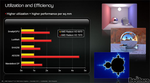 GPU ÄÄÇ»ÆÃ ¼º´ÉÀº ½ºÄù¾î mm (sq.mm ´ç ¼º´É) ´ç ¿¬»ê ¼º´ÉÀÌ °³¼±µÇ¾ú´Ù. ¶óµ¥¿Â HD 7970ÀÌ ¶óµ¥¿Â HD 6970 ´ëºñ 2¹è¿¡¼ ÃÖ´ë 4¹è ÀÌ»ó (AES256, ¾ÏÈ£È Ã³¸®)±îÁö Çâ»óµÈ´Ù.