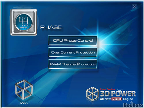 3D Power À¯Æ¿¸®Æ¼·Î Á¦¾î °¡´ÉÇÑ Ç׸ñÀÎ ÆäÀÌÁî (Phase)´Â »ç¿ëÀÚ°¡ CPU¿Í ³»Àå ¸Þ¸ð¸® ÄÁÆ®·Ñ·¯, ½Ã½ºÅÛ ¸Þ¸ð¸® ÆÄ¿ö ·¹º§ÀÇ °úÀü·ù º¸È£ (OCP, Over Current Protection)¿Í PWM ¿ º¸È£ ±â´ÉÀ» Á¶ÀýÇÒ ¼ö ÀÖ´Ù. CPU ÆäÀÌÁî ÄÁÆ®·Ñ ±â´ÉÀº ÇÊ¿äÇÑ °æ¿ì ºÎÇÏ¿¡ µû¶ó ´õ ¸¹Àº Àü·ÂÀ» ½Ã½ºÅÛ¿¡ Á¦°øÇÒ ¼ö ÀÖµµ·Ï ¼³Á¤ÇÑ´Ù.