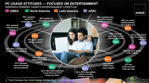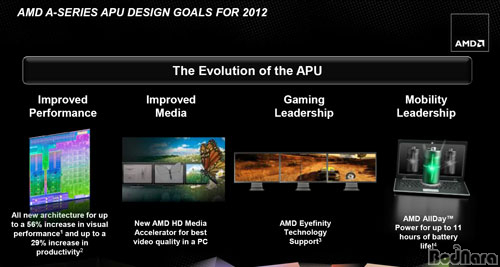 AMD´Â 2012³â °ø°³ÇÒ Æ®¸®´ÏƼ APU Áï, 2¼¼´ë A ½Ã¸®Áî APU¸¦ ÅëÇØ CPU ¼º´É»Ó¸¸ ¾Æ´Ï¶ó Çâ»óµÈ ¹Ìµð¾î ¹× °ÔÀ̹Ö, ¸ÖƼ ¸ð´ÏÅÍ È®ÀåÀ» °¡´ÉÄÉÇϰí ÀÖ´Ù. ¸ð¹ÙÀÏ ½ÃÀå¿¡¼´Â °³¼±µÈ Àü·Â ¹× È¿À²À» ¹ÙÅÁÀ¸·Î ±×µ¿¾È ºÎÁøÇß´ø ½ÃÀå È®´ë¸¦ ¸ñÇ¥·Î Çϰí ÀÖ´Ù.