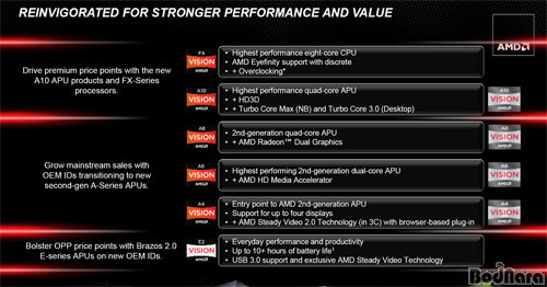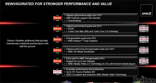 ¸ð¹ÙÀÏ ¶óÀξ÷Àº Æ®¸®´ÏƼ APU¿¡¼ 17-35W·Î 1¼¼´ë ¶ó³ë APUÀÇ 35-45Wº¸´Ù Àü¹ÝÀûÀÎ Àü·Â ¼Ò¸ð°¡ ³·¾ÆÁ® ¿ïÆ®¶ó¾À (Ultrathin) Ç÷§Æû ¸ÞÀνºÆ®¸² ³ëÆ®ºÏ¿¡ ÀûÇÕÇÑ ½ÃÀåÀ» Çü¼ºÇÑ´Ù. ¸ð¹ÙÀÏ ¶óÀξ÷Àº A ½Ã¸®Áî APU·Î ½ÃÀåÀ» °ø·«ÇÑ´Ù. ¾Ë·ç¹Ì´½ ½ºÅ¸ÀÏ ºñÀü ±â¼ú (VISION Technology) ½ºÆ¼Ä¿°¡ »õ·Î Àû¿ëµÈ´Ù.