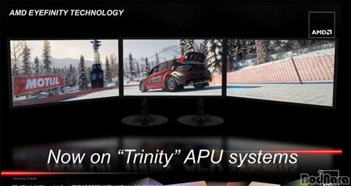 Æ®¸®´ÏƼ APUÀÇ °¡Àå ÁÖ¿äÇÑ Æ¯Â¡ ÁßÀÇ Çϳª´Â ¹Ù·Î ³»Àå GPU¸¸À¸·Î 3´ëÀÇ µð½ºÇ÷¹ÀÌ Ãâ·Â (ÃÖ´ë 4´ë Áö¿ø)ÀÌ °¡´ÉÇØÁø °ÍÀÌ´Ù. ÀÌ´Â ¶óµ¥¿Â HD 7000 ³»Àå GPU¿¡¼ ¿ÜÀå ±×·¡ÇÈ¿¡¼¸¸ Áö¿øÇß´ø AMDÀÇ ¸ÖƼµð½ºÇ÷¹ÀÌ ±â¼úÀÎ ¾ÆÀÌÇÇ´ÏÆ¼ (Eyefinity)¸¦ Áö¿øÇϱ⠶§¹®À̸ç, 4°³ÀÇ µ¶¸³ µð½ºÇ÷¹ÀÌ ÄÁÆ®·Ñ·¯ ³»ÀåÀ¸·Î °¡´ÉÇØÁ³´Ù.