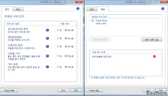 À§ ½ºÅ©¸°¼¦Àº SBAÀÇ USB Â÷´Ü±â ¼³Á¤ ¸Þ´º·Î, ¸ðµç USB ÀåÄ¡¸¦ Â÷´Ü ÇÑ »óÅ¿¡¼ ¿¹¿Ü Àû¿ë¿¡ µî·ÏµÈ USB ÀåÄ¡¸¸À» »ç¿ëÇÒ ¼ö ÀÖÀ¸¹Ç·Î ±»ÀÌ USB Æ÷Æ®¸¦ ¸·À» Çʿ䰡 ¾øÀ¸¸ç, ¿¹¿Ü ¸ñ·Ï¿¡ µî·ÏµÇÁö ¾ÊÀº USB ÀåÄ¡´Â PC¿¡¼ ÀνÄÇÏÁö ¸øÇÑ´Ù.
