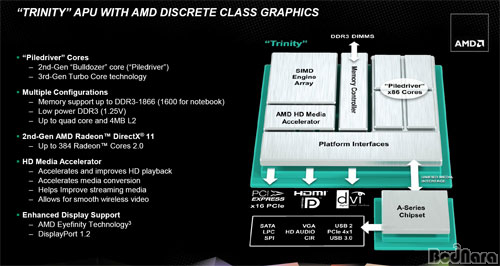 Æ®¸®´ÏƼ APU°¡ 1¼¼´ë APU ¶ó³ë¿Í ±¸ºÐµÇ´Â °¡Àå Å« Ư¡À¸·Î´Â 1¼¼´ë ºÒµµÀú (Bulldozer) ¸ðµâ ±â¹Ý ¾ÆÅ°ÅØÃ³¸¦ °³¼±ÇÑ 2¼¼´ë ºÒµµÀú ÆÄÀϵå¶óÀ̹ö (Piledriver) ÄÚ¾î¿Í »õ·Î¿î ¶óµ¥¿Â HD 7000 ½Ã¸®Áî ³»Àå GPU°¡ ÅëÇÕµÈ °ÍÀÌ´Ù.