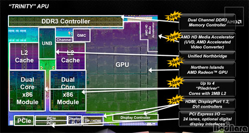 Æ®¸®´ÏƼ APU´Â ¶ó³ë APU¿Í °°Àº 32nm °øÁ¤À» µµÀÔÇÑ ÇÁ·Î¼¼¼Áö¸¸ Æ®¸®´ÏƼ´Â »õ·Î¿î ¸ðµâ ±â¹Ý ÆÄÀϵå¶óÀ̹ö ¾ÆÅ°ÅØÃ³¿Í ¶óµ¥¿Â HD 7000 ½Ã¸®Áî ³»ÀåÀ¸·Î ¶ó³ë ´ëºñ Æ®·£Áö½ºÅÍ ¼ö¿Í ´ÙÀÌ »çÀÌÁî°¡ ¼ÒÆø »ó½ÂÇß´Ù.