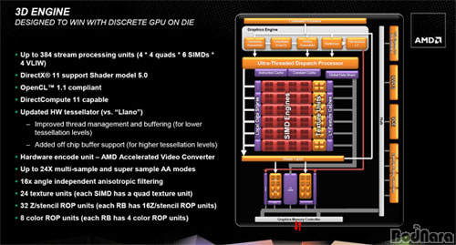 Æ®¸®´ÏƼ ³»Àå GPU´Â DX11°ú ÃÖ´ë 384SP, GPGPU¸¦ À§ÇÑ DirectCompute 11°ú OpenCL 1.1, ¾÷±×·¹À̵åµÈ Çϵå¿þ¾î Å×¼¿·¹ÀÌÅÍ (Tessellator), Çϵå¿þ¾î ÀÎÄÚµå À¯´ÖÀÎ AMD AVC (Accelerated Video Converter), 24X ¸ÖƼ »ùÇà ¹× ¼öÆÛ »ùÇà AA, 16x ºñµî¹æ¼º ÇÊÅ͸µ (Anisotropic Filtering), 24 ÅØ½ºÃ³ À¯´Ö (SIMD ´ç Äõµå ÅØ½ºÃ³ À¯´Ö), 8 color ROPs (RB ´ç 4 color ROPs À¯´Ö) µîÀ» Á¦°øÇÑ´Ù.