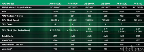 A6 ½Ã¸®Áî¿Í A4 ½Ã¸®Áî APU´Â µà¾óÄÚ¾î ±â¹ÝÀ¸·Î A6-5400K (3.6GHz/ Åͺ¸ 3.8GHz, 1MB ij½¬, HD 7540D (192SP, 760MHz), TDP 65W)¿Í A4-5300 (3.4GHz/ Åͺ¸ 3.6GHz, 1MB ij½¬, HD 7480D (128SP, 723MHz), TDP 65W)ÀÇ 2Á¾ÀÌ´Ù.