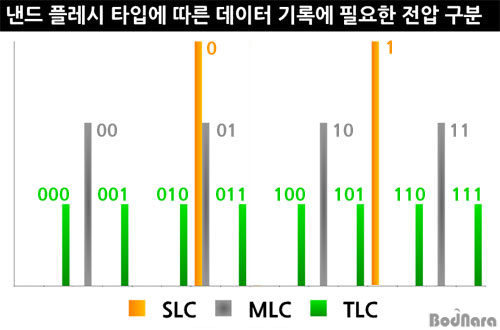 ÇöÀç »ó¿ëÈµÈ ³½µå Ç÷¡½Ã´Â ¼¿ ´ç ÀúÀåÇÒ ¼ö ÀÖ´Â bit ¼ö¿¡ µû¶ó 1bit ÀúÀåÀÌ °¡´ÉÇÑ SLC(Single Level Cell), 2bit ±â·ÏÀÌ °¡´ÉÇÑ MLC(Multi Level Cell), 3bit ¾²±â°¡ °¡´ÉÇÑ TLC(Triple Level Cell)·Î ±¸ºÐµÈ´Ù.