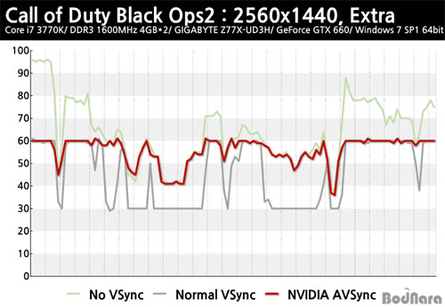 À§ Â÷Æ®´Â Áö³ CoD ºí·¢ ¿É½º2 º¥Ä¡¸¶Å©¿Í µ¿ÀÏÇÑ È¯°æ¿¡¼ VSync¸¦ Àû¿ëÇÏÁö ¾Ê¾ÒÀ» ¶§, ÀÏ¹Ý VSync ¹× NVIDIA(¿£ºñµð¾Æ) AVSync¸¦ Àû¿ëÇßÀ» ¶§ÀÇ ¼º´É º¯È¸¦ Fraps·Î ÃøÁ¤ÇØ ±×·¡ÇÁ·Î Á¤¸®ÇÑ °ÍÀÌ´Ù.(ÁöÆ÷½º GTX 660 »ç¿ë)