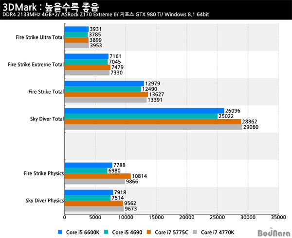 ÁöÆ÷½º GTX 980 Ti¿Í 3DMark¸¦ ÀÌ¿ëÇÑ °ÔÀÓ ¼º´É¿¡¼´Â ½ºÄ«ÀÌ·¹ÀÌÅ© ÄÚ¾î i5 6600K¿¡ Àü¼¼´ë ÇÏÀÌ¿£µå ¸ðµ¨ÀÎ ÄÚ¾î i7 ½Ã¸®Á´Ù ³ôÀº ¼º´ÉÀ» ±â´ëÇϱâ´Â ¾î·ÆÁö¸¸, Àü¼¼´ë µ¿±Þ ¸ðµ¨ÀÎ ÄÚ¾î i5 4690°ú ºñ±³Çؼ Å©Áö´Â ¾ÊÁö¸¸ ¼ÒÆøÀÇ ¼º´É Çâ»óÀ» ±â´ëÇÒ ¼ö ÀÖ´Ù.