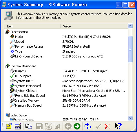 À̰ÍÀº À©µµ¿ì·Î ÁøÀÔ°¡´ÉÇÑ ÃÖ°íŬ·°ÀÎ 169Mhz»óÅ¿¡¼­ À©µµ¿ì·Î ÁøÀÔÇÑÈÄ SandraÀÇ ½Ã½ºÅÛÁ¤º¸¸¦ ĸÃÄÇØ³í °ÍÀ¸·Î Áß¾Ó¿¡ ¸ÞÀκ¸µå Á¤º¸¿Í FSBµîÀÌ ³ª¿ÍÀÖ´Â °ÍÀ» º¼ ¼ö ÀÖÀ» °ÍÀÌ´Ù.