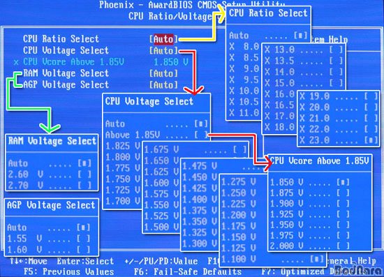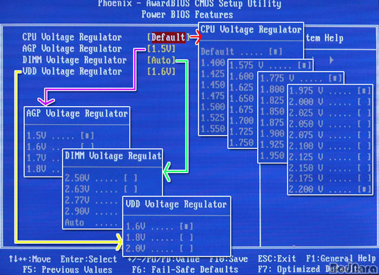 CPU, ¸Þ¸ð¸®, AGPÀÇ ¼¼°¡Áö ºÎºÐ¿¡ ´ëÇØ Á¶ÀýÇÒ ¼ö ÀÖ´Ù. CPU Àü¾ÐÀº ±âº»ÀûÀ¸·Î´Â 1.825V±îÁö ¿Ã¸± ¼ö ÀÖÀ¸¸ç 1.85VÀÌ»óÀº