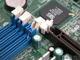 DIMM, DDR266¿¡¼¾ß 3°³ÀÇ DIMMÀ» »ç¿ëÇÒ ¼ö ÀÖ´Ù°í ¾ð±Þ µÇ¾î ÀÖÀ¸³ª, SiS661FX ³ë½ººê¸®ÁöÀÇ ½ºÆåÀº DDR400À¸·Î