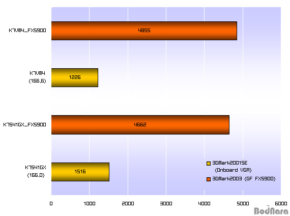 3DMark Å×½ºÆ®¸¦ ÅëÇØ ³»Àå ±×·¡ÇÈÄÚ¾îÀÇ ¼º´ÉÀ» È®ÀÎÇØ º¸¸é, ¸Þ¸ð¸® ´ë¿ªÆø ¼Ò¸ð°¡ Àý¹Ý¹Û¿¡ µÇÁö ¾Ê´Â K7S41GX°¡ ¿ÀÈ÷·Á ´õ ³ôÀº ½ºÄھ ±â·ÏÇÏ´Â °ÍÀ» º¼ ¼ö ÀÖ´Ù. ƯÈ÷ ÇÊ·¹ÀÌÆ®ÀÇ °æ¿ì¿¡´Â µÎ ¹è Á¤µµÀÇ Â÷À̰¡ ³­´Ù. SiS741GX°¡ KM400¿¡ ºñÇØ ÄÚ¾î ¿£ÁøÀÇ ¼º´ÉÀÌ ´õ ¶Ù¾î³­ °ÍÀÌ´Ù. ¿À¹öŬ·°À» ÇÏÁö ¾ÊÀº »óÅ¿¡¼­ÀÇ ¼º´ÉÀÌ´Ï, FSB¸¦ ³ô¿© »ç¿ëÇÑ´Ù¸é ±×·¡ÇÈÄ«µå¸¦ À§ÇÑ ºñ¿ëÀ» 2~3¸¸¿ø Á¤µµ´Â Àý°¨½ÃÄÑ ÁÙ °ÍÀÌ´Ù.