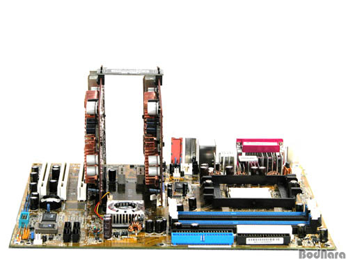 ½ÇÁ¦ SLI¸¦ Áö¿øÇÏ´Â NVIDIA GeForce 6600GT ±×·¡ÇÈ Ä«µå 2°³¸¦ °ñµå ÇΰŷΠ¿¬°áÇÑ ¸ð½ÀÀÌ´Ù. °ñµå ÇΰÅÀÇ °æ¿ì SLI ¸ÞÀκ¸µå¸¦ Áö¿øÇÏ´Â A8N-SLIÀÇ °ÍÀ¸·Î A8N-EÀÇ °æ¿ì º°µµ·Î ±¸ÇÒ ¼ö ÀÖ´Ù¸é, SLIÀÇ ±¸¼ºµµ ½ÃµµÇغ¼ ¼ö ÀÖ´Ù. A8N-SLI¿Í ½½·Ô »çÀÌÀÇ °ø°£ÀÌ ºñ±³Àû ³Ð¾î °Å¸®°¡ Á¼Àº Ÿ»çÀÇ Á¦Ç°µé¿¡ ºñÇØ Äð·¯ ¼³Ä¡ÀÇ Á¦¾àÀÌ ºñ±³Àû ´úÇÑ ÆíÀÌ´Ù.