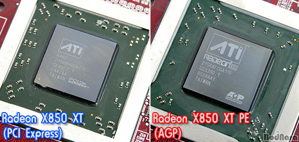 PCI Express ¹öÀüÀ¸·Î ¸ÕÀú Ãâ½ÃµÈ Radeon X850 XT(PE)ÀÇ ÄÚ¾î´Â R480À̶ó´Â ÄÚµå¸íÀ̾ú´Âµ¥, AGP ¹öÀüÀÇ Radeon X850 XT PE¿¡´Â ÄÚµå¸í ´ë½Å Radeon X850À̶ó´Â Ĩ¼Â À̸§ÀÌ ¸¶Å·µÇ¾î ÀÖ´Ù. µÎ Ĩ¼Â ¸ðµÎ ÄÚ¾î ¿ìÃø ÇÏ´Ü¿¡ Áö¿øÇÏ´Â ÀÎÅÍÆäÀ̽º ·Î°í°¡ »õ°ÜÁ® Àִµ¥ PCI Express´ë½Å AGP ·Î°í°¡ º¸ÀδÙ. »çÁøÀ¸·Î´Â ±¸ºÐÀÌ Àß µÇÁö ¾ÊÁö¸¸ ÄÚ¾îÀÇ Å©±â´Â AGP ¹öÀüÀÇ Radeon X850 XT PE°¡ ¾à°£ ÀÛ´Ù. ÄÚ¾î Ŭ·°Àº PCI Express ¹öÀüÀÇ Radeon X850 XT PE¿Í µ¿ÀÏÇÑ 540MHzÀÌ¸ç ±âÁ¸ÀÇ Radeon X800 ½Ã¸®Áî¿Í ±â´ÉÀº µ¿ÀÏÇÏ¿© 16°³ÀÇ Çȼ¿ ÆÄÀÌÇÁ¶óÀÎ, 6°³ÀÇ ¹öÅØ½º ÆÄÀÌÇÁ¶óÀÎÀ» °¡Áö°í ÀÖÀ¸¸ç, Çȼ¿ ¼¼ÀÌ´õ 2.0b¿Í ¹öÅØ½º ¼¼ÀÌ´õ 2.0À» Áö¿øÇÑ´Ù.