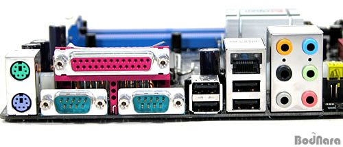 ¹éÆÐ³Î ±¸¼ºÀº Æò¹üÇÏ¸ç »ó´ÜºÎÅÍ PS/2 ¸¶¿ì½º¿Í Űº¸µå, ½Ã¸®¾ó Æ÷Æ® 2°³, ÆÐ·¯·² Æ÷Æ®, USB 2.0 4Æ÷Æ®¿Í ·£ Æ÷Æ®, ¸¶Áö¸·À¸·Î 6°³ÀÇ »ç¿îµå Ãâ·ÂÀ» À§ÇÑ ´ÜÀÚ¸¦ Á¦°øÇÑ´Ù. ±×·¯³ª, Intel High Definition Audio¸¦ Áö¿øÇÔ¿¡µµ SPDIF³ª Coxial Ãâ·ÂÀº Áö¿øµÇÁö ¾Ê°í ÀÖ´Ù.
