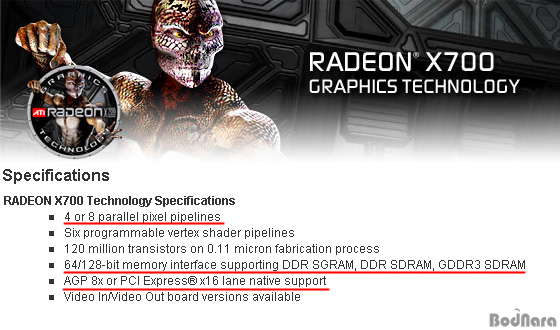 ATI Radeon X700 AGP¿¡´Â PCI Express¿ë Radeon X700 ±×·¡ÇÈ Ä¨¼ÂÀ» ±×´ë·Î »ç¿ëÇÏ¿© µ¿ÀÏÇÑ 0.11Micron Á¦Á¶ °øÁ¤¿¡ 8°³ÀÇ Çȼ¿ ÆÄÀÌÇÁ¶óÀÎ, 6°³ÀÇ ¹öÅØ½º ÆÄÀÌÇÁ¶óÀÎ, 128bit ¸Þ¸ð¸® ÀÎÅÍÆäÀ̽º¸¦ °¡Áö°í ÀÖ´Ù. ´ç¿¬È÷ Áö¿ø ±â´Éµµ  Shader Model 2.0b¿¡ Smart Shader HD, Smooth Vision HD, 3Dc, Hyper HD, Video Shader HD µî PCI Express¿ë Á¦Ç°°ú °°´Ù.