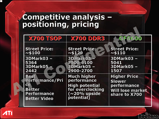 ATI¿¡¼­ ¸¸µç ÇÁ¸®Á¨Å×ÀÌ¼Ç ÀÚ·á¿¡¼­´Â ATI¿¡¼­ Ãâ½ÃÇÏ´Â Radeon X700ÀÇ Á¾·ù¿Í °¡°Ý, ±×¸®°í °æÀï»çÀÇ Á¦Ç°°ú ºñ±³ÇÑ ÀÚü Å×½ºÆ® °á°ú°¡ ³ª¿ÍÀÖ´Ù. 100´Þ·¯´ë·Î Ãâ½ÃÇÒ TSOP ¸Þ¸ð¸®¸¦ »ç¿ëÇÑ X700 TSOP(Radeon X700 ³ë¸Ö>) Á¦Ç°ÀÌ GeForce 6600 ³ë¸Ö Á¦Ç°°ú °æÀïÇÒ °ÍÀ̶ó´Â °ÍÀº ½±°Ô ¿¹»óÇÒ ¼ö ÀÖÁö¸¸, DDR3 ¸Þ¸ð¸®¸¦ »ç¿ëÇÒ X700 DDR3ÀÇ °¡°ÝÀÌ 120´Þ·¯·Î ÀâÇôÀÖ´Ù´Â °ÍÀº ¿¹»ó ¿Ü´Ù. (¹°·Ð ÀÌ´Â ATI°¡ »êÁ¤ÇÑ °ÍÀ¸·Î ½ÇÁ¦·Î ¸Þ¸ð¸®¸¦ ±¸Çؼ­ Á¦Ç°À» ¸¸µé¾î¾ß ÇÏ´Â Á¦Á¶»ç³ª ±¹³» ¼öÀÔ/ÆÇ¸Å»ç ÀÔÀå¿¡¼­´Â ÁöŰ±â ¾î·Á¿ï °ÍÀÌ´Ù)