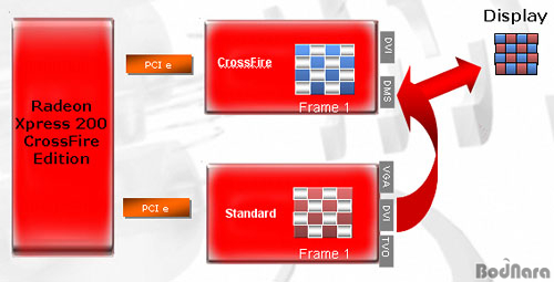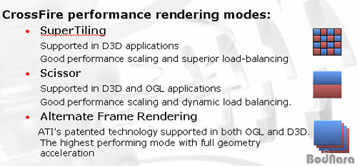 ATIÀÇ CrossFireµµ ȸéÀ» ·£´õ¸µ ½Ãų¶§ ÇѰ¡Áö ¹æ½Ä¸¸ »ç¿ëÇÏ´Â °ÍÀÌ ¾Æ´Ï¶ó nVIDIA ó·³ ¿©·¯°³ÀÇ È¸é ·£´õ¸µ ¹æ½ÄÀ» »ç¿ëÇÑ´Ù. nVIDIA´Â ÇϳªÀÇ È¸éÀ» µÎ °³·Î ºÐÇÒÇÏ¿© µÎ °³ÀÇ GPU¿¡ °¢°¢ ºÎ´ã½ÃÄÑ ·£´õ¸µ ½ÃŰ´Â ¹æ½Ä°ú ÇϳªÀÇ ÇÁ·¹ÀÓ¾¿ µÎ °³ÀÇ GPU¿¡ ³ª´²¼ ·£´õ¸µ ½ÃŰ´Â ¹æ½ÄÀ» »ç¿ëÇϴµ¥ ATI´Â ¿©±â¿¡ ÇѰ¡Áö ¹æ½ÄÀ» ´õ Ãß°¡ÇÑ ·£´õ¸µ ¹æ½ÄÀ» »ç¿ëÇÑ´Ù.