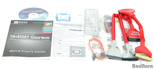 ÇöÀç ½ÃÀå¿¡ ÆÇ¸ÅÁßÀÎ MSI 945P Neo-FÀÇ ±¸¼º¹°ÀÌ´Ù. ±âÁ¸ »ùÇà Á¦Ç°¿¡¼­ Á¦°øµÇÁö ¾Ê¾Ò´ø 945P Series ¸Å´º¾ó°ú ¼³Ä¡CD, SATA Àü¿ø ÄÉÀ̺í, SATA µ¥ÀÌÅÍ ÄÉÀ̺í, CPU ¼³Ä¡ °¡À̵å, Àü¿ë I/O ½¯µå, DTS Effect »ç¿ë¹ý ¼³¸í¼­, CPU ¼³Ä¡ °¡ÀÌµå »ç¿ë¹ý ¼³¸í¼­, Debug LED ¹× USB 2.0 È®Àå Æ÷Æ®¸¦ Á¦°øÇÑ´Ù. Ç®½ºÆå¿¡ Áö¿øÇÏ´Â IEEE1394 È®Àå Æ÷Æ®´Â Á¦°øµÇÁö ¾Ê´Â´Ù.