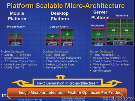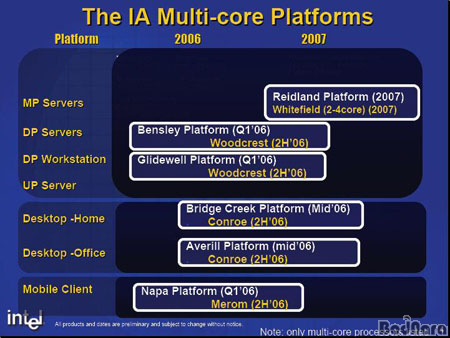 ¼­¹ö Ç÷¡Æû : ¼­¹ö¿ë ÇÁ·Î¼¼¼­µéµµ 2006³â ÈĹݱⰡ µÇ¸é »õ·Î¿î Microarchitecture°¡ Àû¿ëµÈ µà¾ó ÄÚ¾î ÇÁ·Î¼¼¼­ÀÎ ÄÚµå¸í Woodcrest Äھ µîÀåÇÒ ¿¹Á¤¿¡ ÀÖÀ¸¸ç ÀÌ Äھ µ¥½ºÅ©Å¾¿ë ConroeÄÚ¾îó·³ ´Ù¾çÇÑ ¿ë·®ÀÇ Ä³½¬°¡ Àû¿ëµÈ Á¦Ç°ÀÌ µîÀåÇÒ ¿¹Á¤¿¡ ÀÖ´Ù°í ÇÑ´Ù.