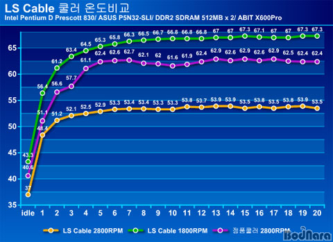 ¿Âµµ Å×½ºÆ®¸¦ ÁøÇàÇϱâ À§ÇØ Intel Pentium D 830 CPU¸¦ ±âº»Àü¾Ð »óÅ·ΠÀÎÅÚ Á¤Ç° Äð·¯¿Í ÇÔ²² ºñ±³ÇÏ¿© º¸¾Ò´Ù. ¿Âµµ üũ´Â µðÁöÅÐ ¿Âµµ°èÀÇ ¼¾¼­¸¦ CPU¿Í ¹ÐÂøÇÏ¿© ÃøÁ¤ÇÏ¿´°í ÀÌ ¿Âµµ üũ ¹æ¹ýµµ Á¤È®ÇÏ´Ù°í ¸»ÇÒ ¼ö´Â ¾øÁö¸¸ Äð·¯µé °£ÀÇ »ó´ëÀûÀÎ ºñ±³´Â ÇÒ ¼ö ÀÖÀ» °ÍÀÌ´Ù. Ãß¿öÁø °¡À»³¯ÀÎ ¿äÁîÀ½¿¡ ÃøÁ¤ÇÏ¿´±â ¶§¹®¿¡ ¿©¸§Ã¶°ú´Â »ó´çÇÑ Â÷À̸¦ º¸À̸ç, ¼³Ä¡ ¹æ¹ýÀ̳ª ±âŸ ȯ°æ¿¡ ¹Î°¨ÇϹǷΠÀý´ëÀûÀÎ ¼öÄ¡·Î º¸´Â °Í º¸´Ù´Â »ó´ëÀûÀÎ ¼öÄ¡·Î Âü°í ÀÚ·á·Î ÀÌ¿ëÇÏ¸é µÈ´Ù.