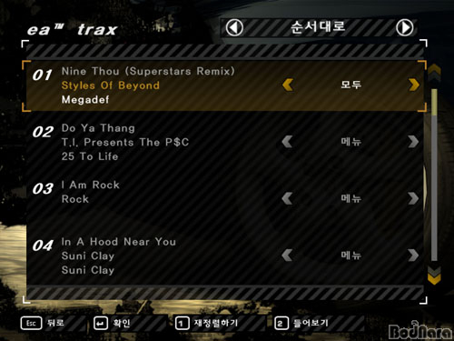 EA trax ¸ðµå´Â °ÔÀÓ¿¡ µé¾î°£ À½¾ÇÀ» ¿øÇÏ´Â ¸ðµå¿¡¼­ µéÀ» ¼ö ÀÖµµ·Ï ÁöÁ¤ÇÒ ¼ö ÀÖ´Ù. °°Àº ¸Þ´º¿¡ ¿©·¯ °³ÀÇ À½¾ÇÀ» ÁöÁ¤ÇÏ¸é ±× ¸Þ´º¿¡¼­´Â ÁöÁ¤µÈ À½¾Ç °¡¿îµ¥ ·£´ýÀ¸·Î Ç÷¹ÀÌ µÈ´Ù.